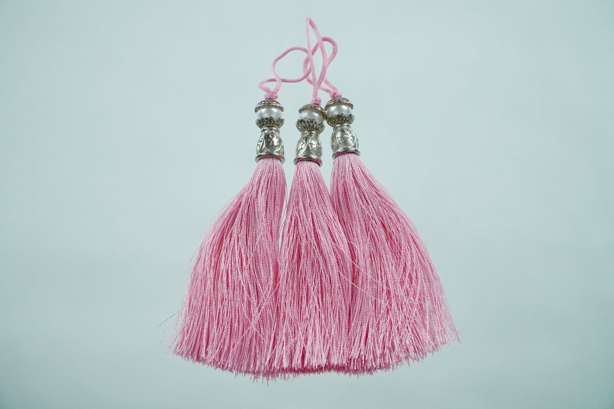 Chwost z perłą i koralikiem srebrnym, pudrowy róż, 12 cm